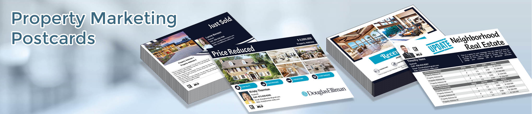 • Need postcards for your next direct mail campaign? We have over fifty categories of branded designs for our Douglas Elliman International real estate agents to use! Our postcards are printed on heavy 130 pound stock paper with a high-quality UV coating. (None of the flimsy stuff for our clients!) Select from standard size (4.5” x 5.5”) or make a bigger splash with our jumbo (5.5” x 8.5”) postcards. Craft your own custom card in minutes using our online design center’s vast library of custom templates and graphics with your own images and text.