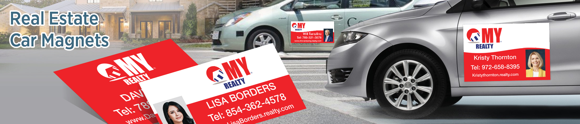 Car magnets are a versatile solution for real estate professionals who want to increase their visibility and name recognition. All of our magnets are printed on a durable 30 mil magnet stock, with gloss coating on the front to ensure readability. These real estate car magnets are a great way to promote individual agents or an entire office. With our easy ordering process, you can have an official My Realty branded car magnet complete with your name, contact information, and even photo, at your doorstep in just a few days!