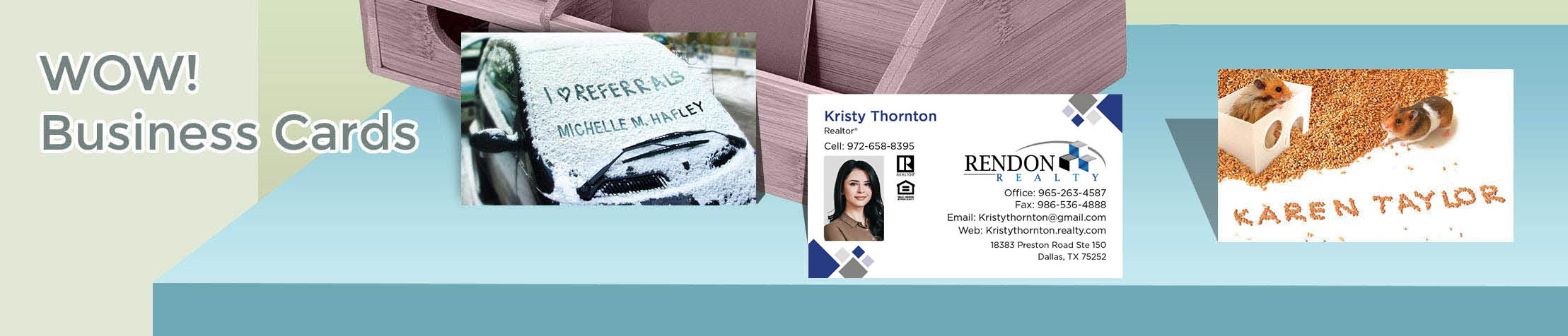 Looking to add a touch of WOW! factor to your real estate business cards? These cards are just what you've been looking for. The front of the card has plenty of space for all the traditional business and contact information you want to include. But instead of a boring white back, the reverse of the card lets you spell out your name in snow flakes, autumn leaves, or even Easter eggs. It's a great way to add some personality, some pizazz, even some WOW! to your Rendon Realty real estate business cards!