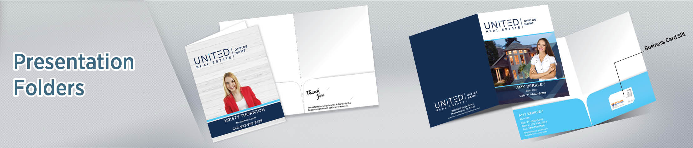 Custom United Real Estate presentation folders from BestPrintBuy help you present all your information elegantly and efficiently. With our custom real estate presentation folders featuring business card slots, your contact information will be easily at hand. There’s no second chance when it comes to making a first impression. If you’re presenting a listing agreement, marketing plan, contract offer, or other important documents, you want your clients to know that you’re a reliable and trustworthy professional. Contact us to ensure your next presentation makes a lasting impact with United Real Estate presentation folders!